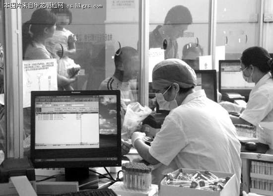 近日清早,记者来到市中心医院的门诊采血室,只见室内人头攒动,每个采血窗口前都排起长龙。数名身着白大褂的医务人员正拿着针管麻利地进行采血,从输入资料到换针,从摸找血管到采血完毕,整个过程仅短短数分钟时间。