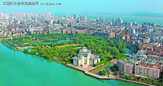从空中俯瞰汕头,总面积20.18公顷的中山公园四面环水一片葱翠,宛若城市绿肺。正门牌楼、假山、玉鉴湖、九曲桥等等尽收眼底,令人心旷神怡。马卡摄