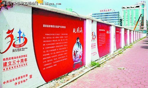 本报讯(记者杨可)市区主干道的灯柱穿上了红色的外衣,倡导现代文明、制作精美的公益广告牌挂上了交通隔离栏,白坯建筑土围墙覆盖上喷画,变成为宣传汕头非遗的文化墙近段时间来,汕头经济特区30周年环境氛围布置工作加紧推进,其中一些富于新意的设计、布置手法让市民眼前一亮。