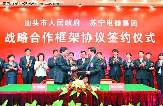 副市长林梃主持签约仪式。在出席仪式的领导和嘉宾见证下,市委副书记、代市长郑人豪与苏宁电器集团副总裁蒋勇签订战略合作框架协议。根据协议,市政府将支持苏宁电器集团在汕头投资建设苏宁广场、苏宁电器广场、现代化物流配送中心等项目,参与我市发展建设。