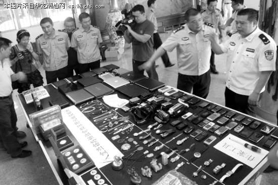 图为警方缴获的首饰、手机等赃物一批。