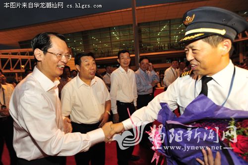 市委书记陈绿平与刚刚完成试飞任务的机组长朱海龙亲切握手。