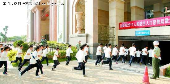 由广州军区、广东省人防办组织的粤东地区人民防空联合行动人口紧急疏散演练于27日下午在市区星湖豪景住宅小区举行。参加演练的有汕头港务集团、汕头港公安局、市交警支队以及市锦泰中学等单位共1000余人,演练取得圆满成功。副市长林梃参加演练活动。图为人们紧张而有序地冲向人防地下室。