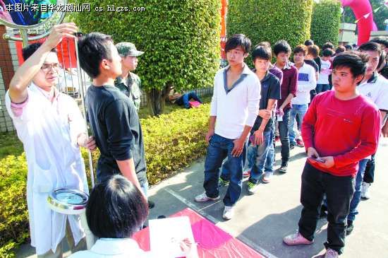 图:我市广大青年踊跃报名参军,图为征兵工作人员正为报名者测量身高。本报记者方淦明摄