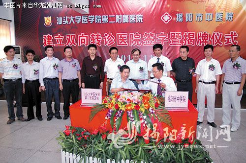 昨天下午,市中医院与汕头大学医学院第二附属医院建立双向转诊协作医院揭牌仪式在市中医院举行(见图。陈路文 摄),这对加快我市医疗卫生事业发展,有效解决广大人民群众看病贵、就医难的问题,起到积极的推动作用。