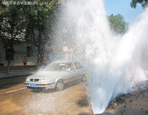 昨天上午10时左右,记者接到报料赶到嵩山路金桂园附近路面时看到,破裂的水管位于路中央地下,从路面破损处喷出的水柱有三四层楼高,射程超过50米。不时有过往的轿车直奔水柱下路面,享受免费洗车。由于喷射而出的水势颇为凶猛,附近路旁出现的积水地带也长逾200米。有的低洼处积水较深,一些摩托车骑士不敢涉水而过,只好绕开。据目击者陈先生介绍,此次水管破裂事故是昨天上午9时多发生的。现场一名市政设施施工人员表示,当时他们正开始在进行路面开挖作业,没想到凿破了这处地下水管。至昨天下午记者发稿时止,破裂处喷涌而出的水已被完全止住,抢修仍在进行。