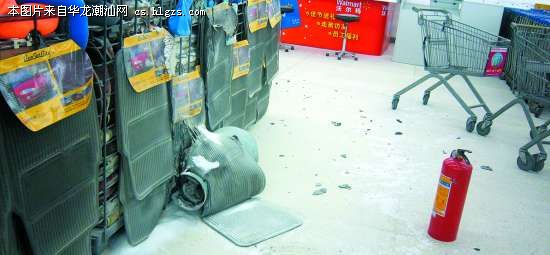 11月4日上午11时左右,一名男子携带两罐15公斤装煤气罐和一瓶汽油进入市区南国商城沃尔玛超市,并在超市内点燃其中一罐煤气罐,引燃了边上的一个货架(见图)。