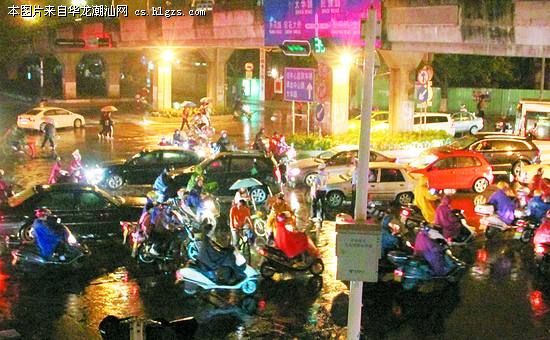 傍晚5点半开始,中山路沿途的几个路口均出现不同程度塞车。在中山路与大华路交界处,等待红灯的车龙也比平时要多上将近一倍。有部分摩托车驾驶员随意闯灯,路口交通一度混乱。中山路与汕樟路交界处是最为拥堵的一段,现场多名交警疏导车流。自东向西等待通过路口的车龙一直排到四中门前,基本需要等待两到三次红灯才能通过。在汕头一中门前路段,接送学生的私家车众多,影响到该路段车流通行。由于行车缓慢,公交车也不能准时到站上下客,而且由于雨天公交车乘客激增,记者看到大部分公交车上面都挤满了乘客。有部分公交车由于车上乘客太多,在停靠站的时候甚至已经无法上客。有学生告诉记者,平日等十分钟的车今天足足等了近半小时仍上不了车,也有的学生则干脆选择步行回家。在陵海路的T字型路口,因为没有设置红绿灯,这里的交通更混乱。