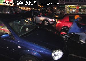 右图:昨天傍晚市区仍雨势不断,长平路部分路段出现拥堵。