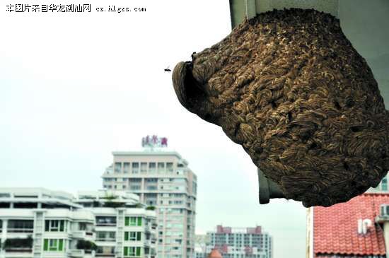 吴先生家住阳光海岸14幢顶楼(12楼)。记者来到吴先生家里看到,巨大的马蜂窝驻扎在卧室的房檐下,马蜂窝高达0.8米,直径约0.6米,成群的马蜂围着蜂巢飞来飞去(图①)。吴先生告诉记者,几天前他无意中发现了这个马蜂窝,蜂巢已经有水桶般大小,我也不知道马蜂从什么时候为在这里建窝。吴先生说。