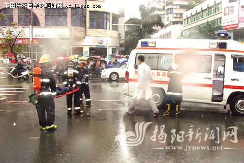 灭火演练现场,消防人员与医护人员正在紧张作业中。