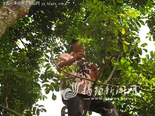 盐渍乌榄是潮汕“杂咸”中的特色食品,其色泽乌亮,咸芳可口,是营养丰富且独具特色的一种腌制小菜,深受潮汕人民喜爱。目前正是乌榄成熟季节,据了解,今年乌榄减产,价格提高,每斤可卖到三至四元。图为果农在树上采摘乌榄。