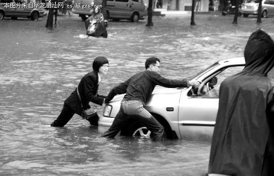大雨如注,市区一些低洼路段出现积水现象,不少机动车辆因此中招熄火,一些摩托车载客者发现了这一临时商机上前帮人推车赚点辛苦费,但有的却趁水打劫索取高价推车费。