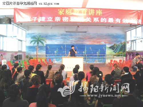 11月12日,揭东县锡场镇育苗幼儿园彩旗飘扬,掌声阵阵,来自广州黄金教育集团的龚卫玲老师,正在为该园的教职工和家长作精彩的家庭教育讲座,主题为《与孩子建立亲密和谐关系的最有效方法》,此次活动是育苗幼儿园配合锡场镇妇联开展的一项主题活动。