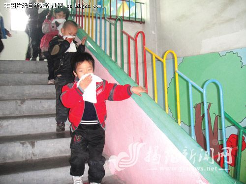 经常开展各种安全教育活动,提高孩子综合能力,图为防火演练