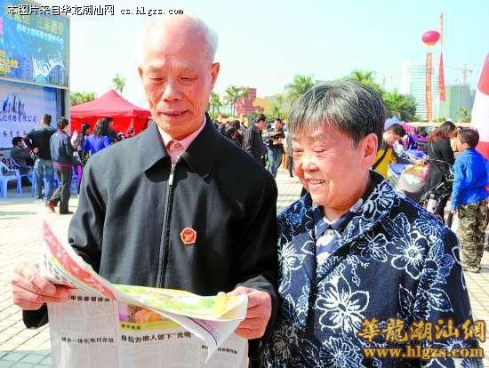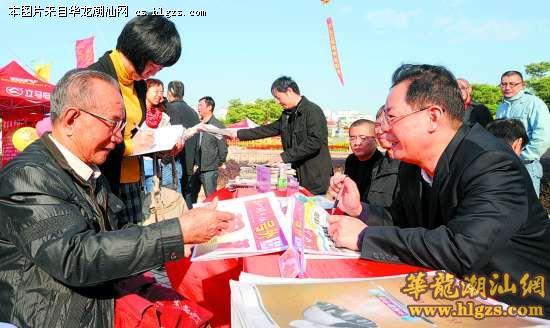 86高龄的读者罗孔仁老先生捧着今年10月21日出版的《汕头日报》号外来到咨询台前,请汕头经济特区报社社长、汕头日报总编辑陈文波为号外签名留念。