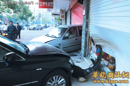 本报讯(记者袁笙摄影报道)昨天早上,许多上班途经黄山路的市民都惊讶地发现,一辆夏利汽车竟然尾部插进潮华雅居的一处临街商铺,旁边还有一辆黑色的皇冠轿车,两辆车都受损严重,这到底是怎么回事?