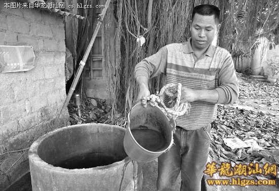 在沟南村民的指引下,在离D济河大约100米远的汕揭高速公路沟南路段施工现场北侧,记者也发现一口水井。与之前看到那口荒废的手摇井不一样,这口水井直径1米多宽,水井深度也超过10米。记者站在井边向井里观察,只见井水满溢,水质也尚清澈。但当村民们打上一桶井水提到记者眼前的时候,一阵阵类似淤泥腐臭的难闻气味立刻扑鼻而来。村民们说,这样的井水,别说是饮用,就是洗刷家具等东西都是不行的。
