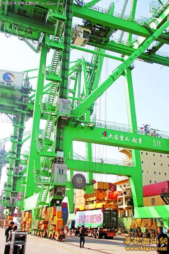 本报讯(记者林馥盛)集装箱发展水平是港口现代化的重要标志,也是反映沿海城市综合竞争力的一个主要指标。昨天上午,汕头港集装箱突破百万标箱庆祝活动在广澳港区举行,随着市委副书记、代市长郑人豪宣布汕头港2011年第一百万个集装箱起吊,汕头港年度集装箱吞吐量首次突破百万标箱,正式跨入百万标箱港口行列,标志着汕头港集装箱初步进入规模化发展阶段,成为粤东、赣南、闽西南等腹地集装箱进出口的主要门户,进一步巩固汕头港作为沿海主要港口、粤东区域中心港口的地位。