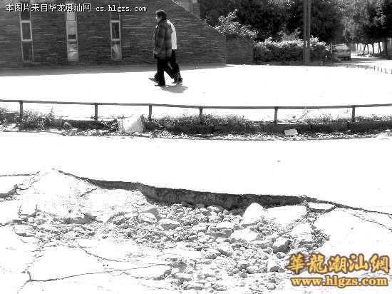 昨天中午12时许,记者来到现场看到,在黄山路旁省水文局汕头分局门口附近的路面中间,果然有一个大坑(见右图)。只见这个大陷阱宽约1米左右,较深处有0.2米左右。虽然有热心市民在坑内填上一些水泥块和沙石等,但大坑看上去还是挺深的。