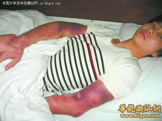 记者昨天在汕大医附二院急诊科看到,小甘全身是伤,四肢呈紫红色肿胀,手臂上除了绳索的勒痕还有明显的条状伤痕(见图)。说起两天来的恐怖日子,小甘一直瑟瑟发抖。小甘告诉记者,这一切都起因于其认识不久的女朋友。小甘今年只有19岁,在龙湖区一家商店当杂工,认识了同样在此打工的一名女子,当时,该女子称自己没有男朋友。前几天,一名自称该女子前男友的男子突然致电小甘,说小甘强奸了他的女朋友,要和他谈谈。小甘对此没有理会。21日,这名男子突然带着3名同伙,气势汹汹找到小甘工作的地方,强行要带小甘出去谈谈,并扬言,小甘不和他们走,他们就要砸掉这间商店。