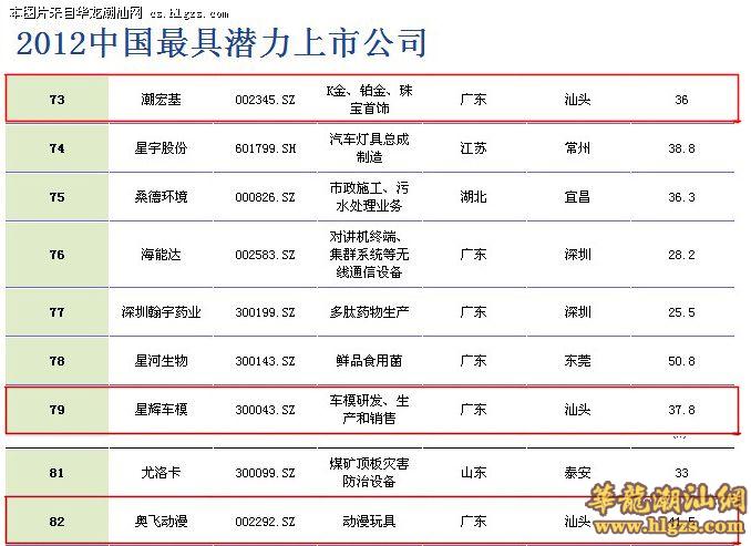 本网讯昨日,《福布斯》中文版发布其2012年度首份榜单中国潜力企业榜,汕头的潮宏基(002345.SZ)、星辉车模(300043.SZ)和奥飞动漫(002292.SZ)分别以第73名、第79名、第82名上榜。今年的中国潜力企业榜,是《福布斯》第八次对中国中小企业进行全面、独立调研,并首次将上市公司与非上市公司分开评选、排名,分别呈现了中国最具潜力上市企业与中国最具潜力非上市企业两张榜单。据悉,福布斯中文版对总计超过1万家2010年销售额在500万元至10亿元人民币之间、主营业务在中国内地的中小型企业进行了研究筛选。并根据企业的增长性指标(销售增长率及利润增长率)、回报率指标(总资产回报率及净资产回报率)、赢利性指标(净利率)和规模指标(销售收入总额及净利润额)进行排名。其中汇川技术夺得中国最具潜力上市企业头名,学而思教育、汤臣倍健分获二、三名,而在中国最具潜力非上市企业榜单中,伟景行科技获得冠军,利德华福电气和杭州炬华科技紧随其后。(记者郑钟展)