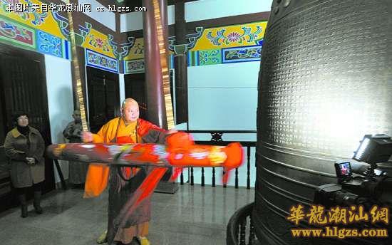 龙年钟声今天凌晨在汕头桑浦山麓铁林寺响起来,寺里的海慧师傅推动木锤撞响了铜钟,钟声在山间回荡远播,祈祷龙年风调雨顺、国泰民安、人民安康。昨天深夜不少市民冒雨来到山上等候新年到来撞钟祝福新年平安、快乐。本报记者张烈华摄