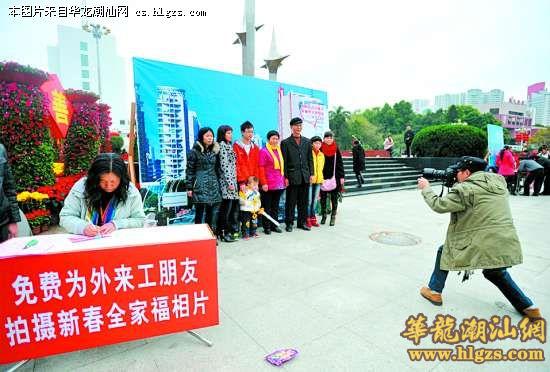 本报讯记者刘超群、通讯员庄少武报道:23日下午,龙湖区政府大楼前广场到处欢声笑语,由龙湖区委宣传部、龙湖区文广新局、龙湖区文化馆主办的欢欢喜喜过新年,龙湖也是我的家2012年龙湖之春游艺广场活动在这里举行,上千名农民工朋友兴高采烈地参加各种趣味的文化活动。游艺广场设置了多项有奖项目,飞镖、敲锣、玩转盘、投硬币现场游园的人们大包小包地将奖品带回家,男女老少乐开怀。其中,新春全家福项目最受欢迎,专门为农民工家庭免费拍照,不到两个小时就有95个农民工家庭扶老携幼排队照相。来自重庆的杨洋今年50多岁,她1993年就到汕头打工,如今一家三代均在汕头扎根,这次赶上难得机会,连同亲戚一家11人一齐合影,每个人脸上都挂着幸福的笑容。