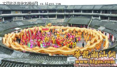 11点多,长龙结束巡游回到土楼前,从楼门右侧绕着土楼外围盘绕起来,当龙头绕行一圈来到楼门左侧时,龙尾刚好摆到楼门右侧,一条238米的长龙把外围216米的土楼团团围住,顿时锣鼓喧天,村民们不由得喝起彩来。不久,长龙缓缓进入土楼,在土楼内盘了三圈才把龙尾收进来。此时,从土楼上往楼内俯视,可见金鳞闪闪的长龙威武地盘旋于楼内,煞是壮观。