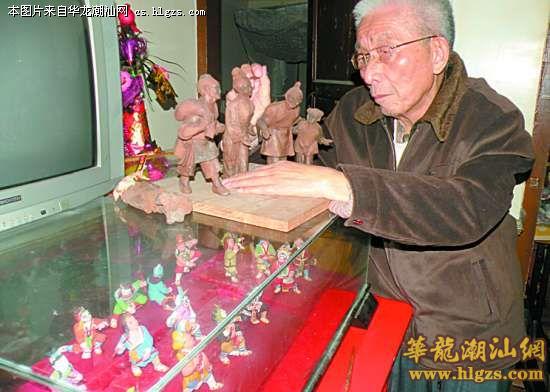 在黄老的客厅里,记者看到,除了几件必要的家具外,客厅的桌子上摆满了作品,桌上一套十八件《潮阳英歌舞》最是引人注目,尽管每件作品只有8厘米高,却色彩分明、神态各异、活灵活现,或击鼓、或敲锣、或执钹,面貌、神情、衣着等均为精雕细琢、互不相同,犹如一场生龙活虎、气势磅礴的广场舞蹈正在献演。