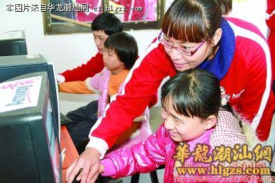 图为安利志愿者在指导西林小学学生操作电脑。 郑玲芝 摄影报道