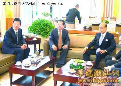 当揭阳市市委书记陈绿平、潮州市市长李庆雄、汕头市市长郑人豪、揭阳市市长陈东等潮汕三市领导到达香港长江集团中心时,得知消息的李嘉诚连忙下楼相迎,握着三市领导的手开心大笑,浓浓亲情令人感动。