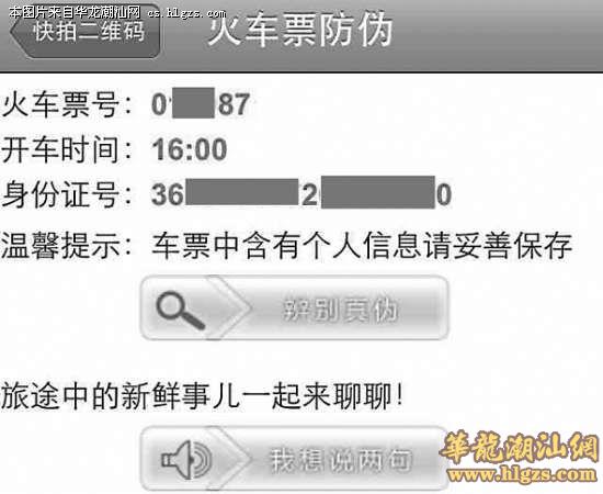 随后记者用手机下载了名为快拍二维码的识别软件,对准车票上的二维码一扫,大约5秒的时间,包括旅客完整身份证号码在内的身份信息便显示在手机屏幕上。