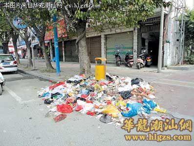 昨天下午,记者在潮枫路西段中国农业银行营业厅附近看到,人行道上一垃圾桶周围堆满了垃圾杂物,而桶中所装垃圾却还不到一半。