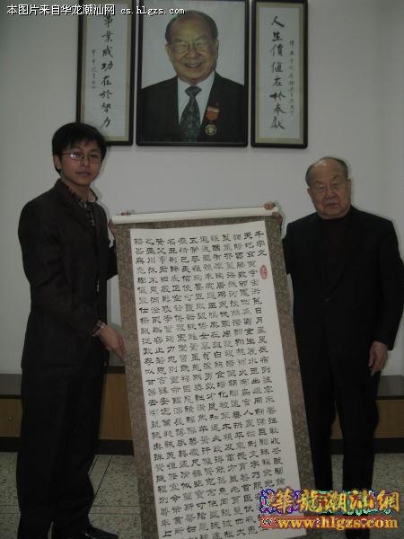 观赏了桥,大家向陈列着陈泽桂部分书法作品走去。陈伟南先生的儿子,香港潮州商会会长陈幼南先生看着陈泽桂以隶书所写的“千字文”时,指着作品问:“这也是你写的”?当得到肯定时,面露表扬的神情。