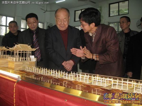 停车埠定,陈伟南先生一行在学校领导介绍下,认识了陈泽桂父子,并在大家的陪同下,走进展示“湘子桥”的学校礼堂。第一次俯视心中的湘桥,大家都赞赏桥的精巧。走在桥边,陈伟南先生边听泽桂介绍“建”桥创作历程,边慢慢的欣赏这竹版湘桥。当看到安放于桥上的H牛时,幽默的说:“呵,一只牛去伊走去了”。当泽桂指着桥东边第一座桥楼向陈伟南先生说:“先生,这就是你捐建的桥楼。”陈伟南先生笑着说:“呵,人家占我,把我捐的楼建又大个。”