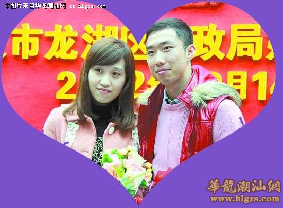 今日是情人节,新人们扎堆登记结婚,有情人终成眷属。图为一对新人到龙湖区民政局结婚登记大厅办理结婚手续。