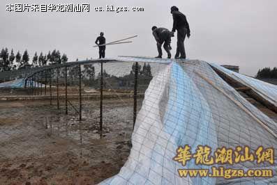 昨天,饶平县G洲镇山家村虾苗养殖户卓先生从福建请来师傅在近三亩地的虾池上搭建保温棚。