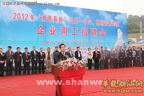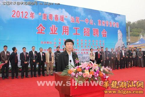 2月15日开始,省、市、城区三级人力资源和社会保障局用两天时间联合在市区玉台山慈云公园举办2012年“南粤春暖”汕尾—中山、惠州劳务对接仪式。市委常委、常务副市长魏友庄宣布活动开幕。