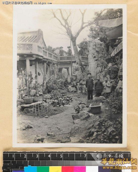 这张照片标明的是拍摄于潮州的“猴洞”,即是“猴洞”庭园,位于潮州市中山路同仁里七号,是一种宅第与书斋相连的独特私家庭园式建筑,其布局以巧妙见称。始建于明代,全座占地900平方米,其中庭园200平方米。相传因其主人喜爱在园中养猴取乐而得名。画面右侧站着四个好奇的小男孩,画面左侧是五名穿着清朝服饰的传统潮州女性,在廊道的上面站着三名女传教士