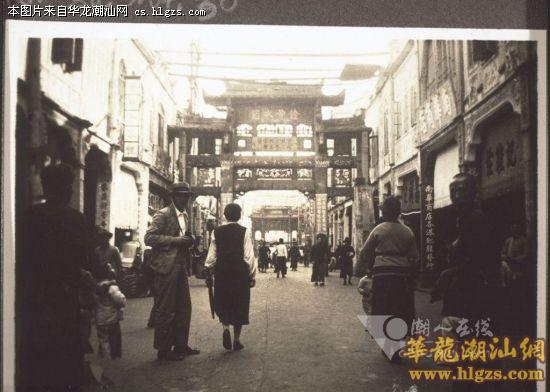 这是一幅最让我心神向往的老照片,拍摄地点是潮州的牌坊街。在画面左侧那个拿着相机的美国人脸上流露着兴奋的神情,他的装束使得在他旁边的两个小孩感到好奇。在男子身后是“理学儒宗坊”,牌坊上“铨曹冰鉴”四个字是那么清晰。男子的右侧是一位拿着雨伞的美国女子,她的脚步是那样轻盈,我能想象她此刻脸上的表情,定是陶醉于这精妙的建筑和这整洁的街道。画面右侧那稍显富态的妇人,我猜想,应该是一名布道的修女,在她身后望着镜头的潮州男子细细打量着手握相机的外国人。那时,这几名外国的到来,不知该引起人们多大的讨论,或许,街道两旁的商铺“南华商店·南华商店各港靴鞋发行”和“记鞋庄”里的老板放下了手头的活儿,跑出来看看这四名蓝眼睛的人。