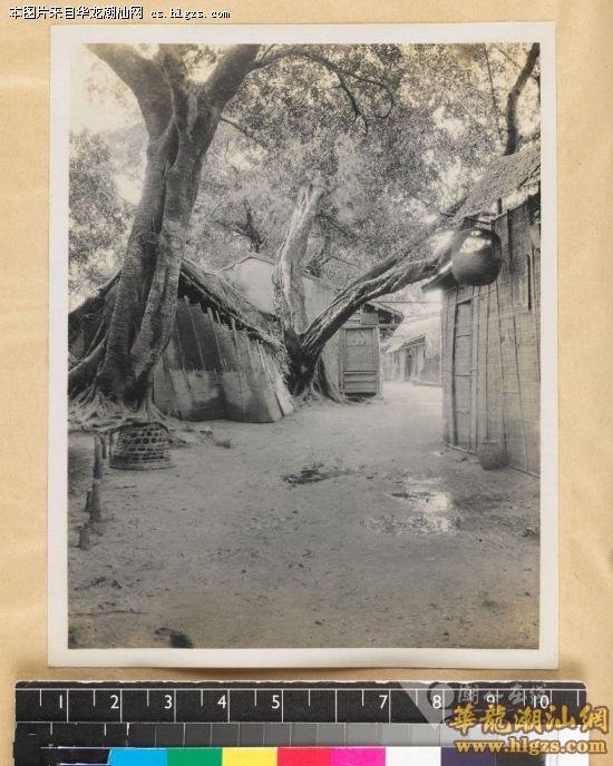 描述:“潮州府的榕树”潮州一条有树和房子的街道。