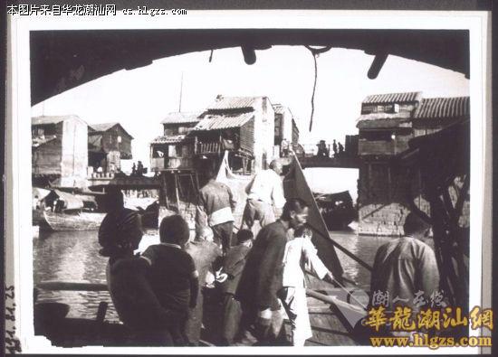 标题:“坐船从汕头到梅县的旅程。船夫撑着客家船只。在潮州附近的大桥后面,于其中的一个码头有两座小庙宇。”