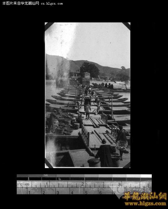 “浮舟桥——潮州府长桥的中心部件。这座桥据说至少有一千年的历史,大概有?米长。保存了中心部件、巨大沉稳的石墩、它们用巨大的石头长条或木梁紧密连接在一起。每个桥墩上有各种各样杂乱的店铺,许多的桥墩上长了大榕树。