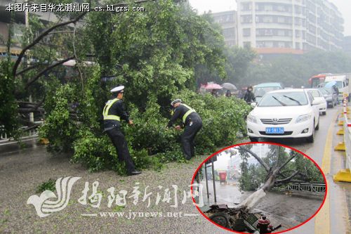 昨天上午,记者接到市民报料称,在榕城区榕华大道与天福路交界处,一棵大树突然倒地,枝繁叶茂的树身横架整个路面,造成现场交通堵塞。