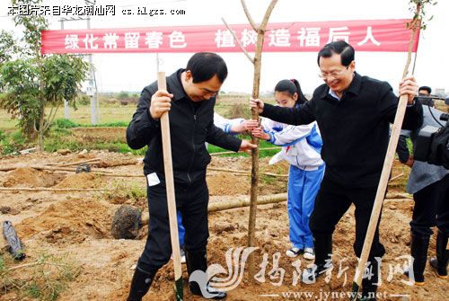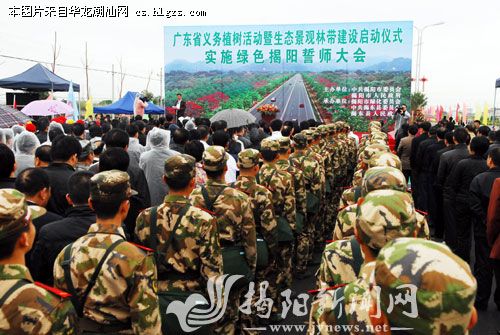 绿化常留春色,植树造福后人。昨天上午,广东省全民义务植树活动暨生态景观林带建设启动总仪式在广州增城主会场隆重举行,揭阳同步启动了活动仪式及实施“绿色揭阳”工程建设誓师大会。市委书记、市人大常委会主任陈绿平,市委副书记、市长陈东带领市四套班子成员及数百名干部群众在揭东开展了声势浩大的植树造林活动。