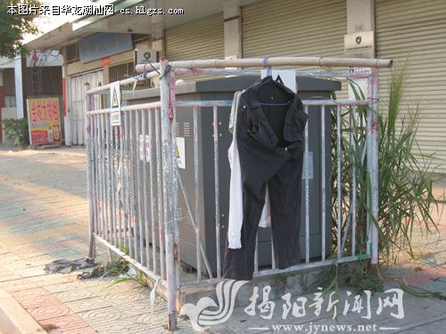 尽管围栏上有醒目的“止步,高压危险”的警示,但仍有居民为图方便,将衣物晾晒在高压箱围栏上。记者近日巡城看到,位于市区新阳路东段一高压箱围栏被绑上了竹竿用于晾晒衣物,看情形已经有好一段时间了。希望有关部门在加强管理的同时,附近居民既要维护城市形象,又要考虑避免事故隐患,不要再将衣物晾晒在高压电箱下。