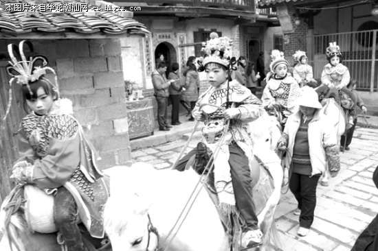 穿过一片桃花林,进入白塘镇洋尾村,只见这里家家户户都在家门口摆上香案,燃放爆竹,处处洋溢着节日的喜庆。“今天是我们村的大节日,每年在这一天都要举行大型民俗活动。”在村里的李氏小宗祠门口,莆田市李氏文化研究会会长李金星对记者说。当天的活动中,该村由各家各户的小孩骑着巡游于村里巷道的马匹有120匹之多。记者看到,浩浩荡荡的巡游队伍中,还有30多名女子扛着写着各自姓氏的“姓旗”,好不热闹!
