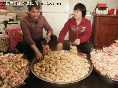 潮安县磷溪镇仙美村农民李成丰,少年跟祖父学艺制作N花,已有30多年,他的小作仿生产的N花,具有酥、脆、松软特点,深受各方青睐。 因N花是用于婚嫁的十二种点心之一种,龙年正月过后,每天不断有人上门要货,令他忙得不可开交。图为李成丰与妻子在忙于包装N花,满足顾客需要。