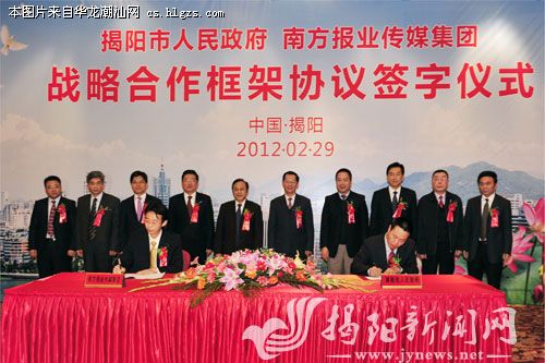 揭阳市正在加紧谋划推进的空港经济区引起广泛关注,南方报业传媒集团强势进驻,将投资建设南方(揭阳)潮汕文化产业园,打造粤东文化产业新亮点。昨天下午,双方战略合作框架协议签字仪式隆重举行。这不仅是华南地区媒体龙头与地方政府深度合作的有益探索,是揭阳启动“空港经济”引擎、积极实施“文化推动”战略的一大举措,也是广东文化产业发展的一大盛事。
